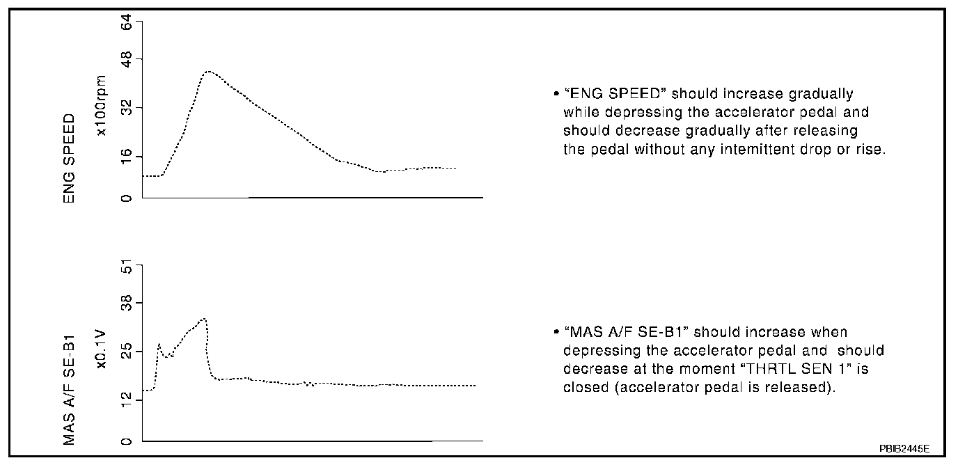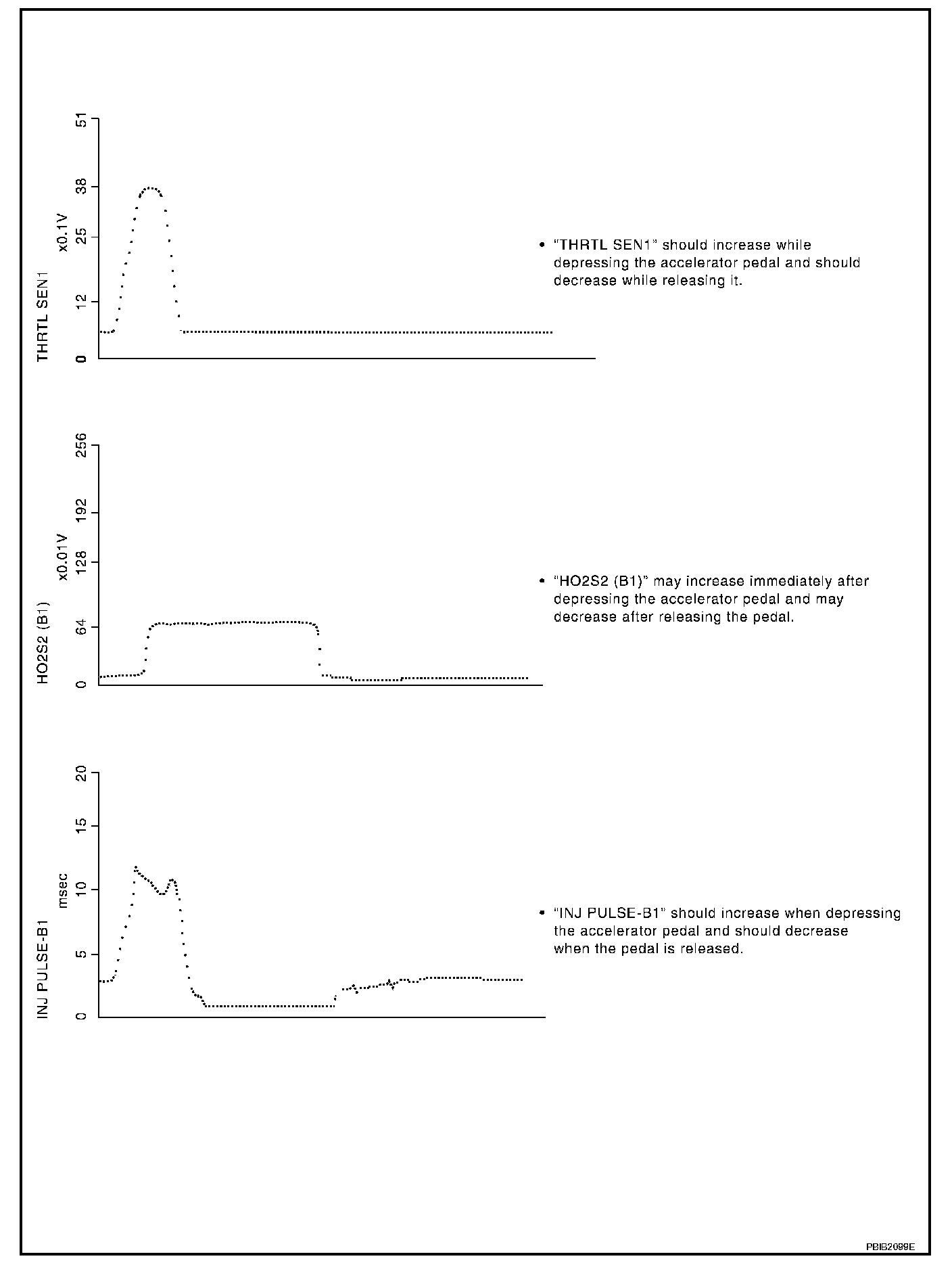 The signal of "ACCEL SEN 1" and "THRTL SEN 1" should rise gradually without any intermittent drop or rise after "CLSD THL POS" is changed from "ON" to "OFF".