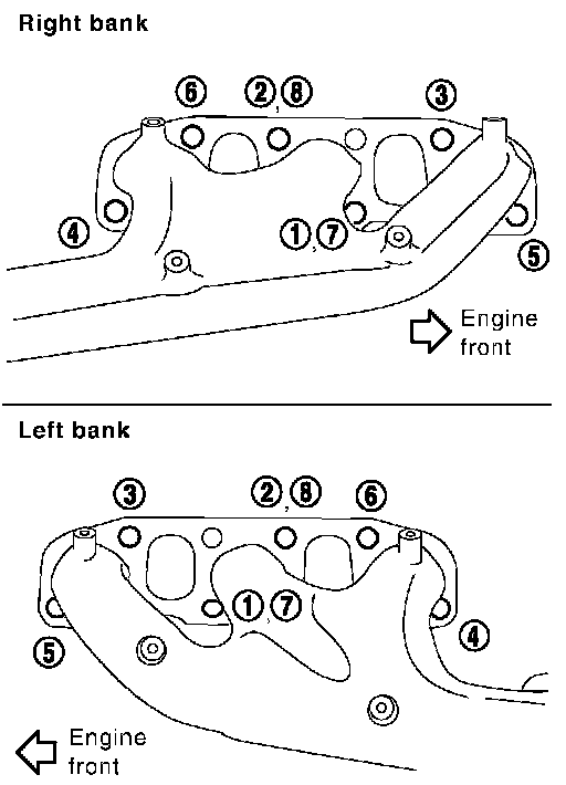 ^ Install exhaust manifold and tighten mounting bolts in numerical order as shown in the figure.