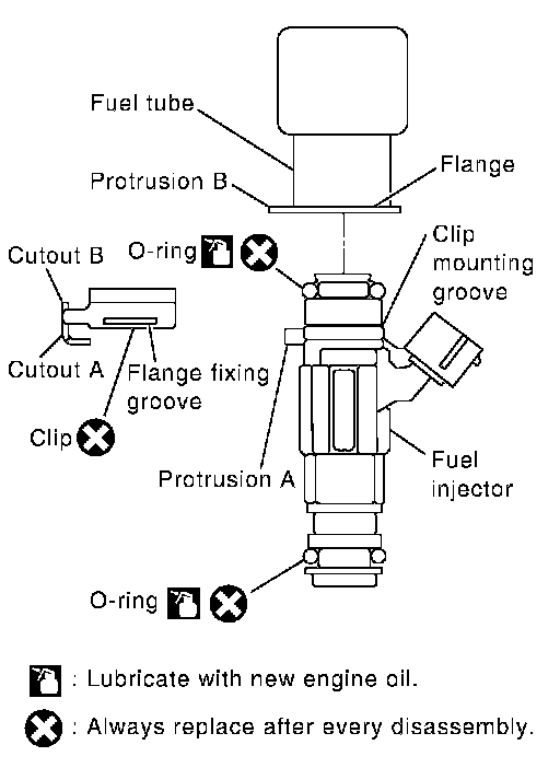 ^ Insert fuel injector so that protrusion B of fuel tube matches cutout B of clip.