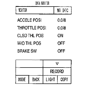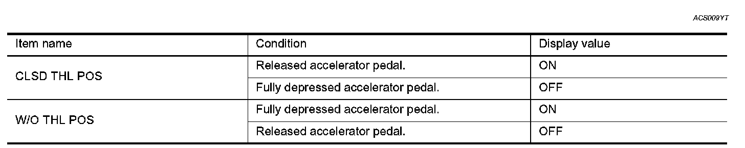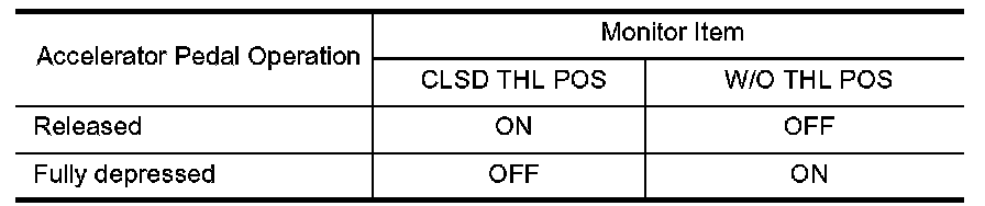 3. Depress accelerator pedal and read out the value of "CLSD THL POS" and "W/O THL POS".