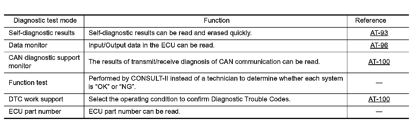 CONSULT-II Function (A/T)CONSULT-II can display each diagnostic item using the diagnostic test modes shown following.