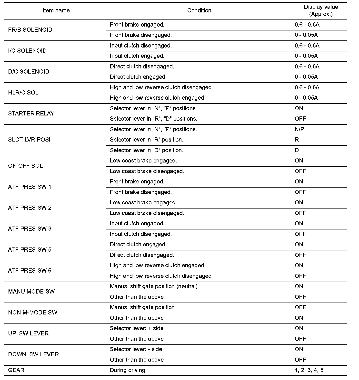 3. Display of solenoid valves on CONSULT-II changes at the start of shifting, while gear position is displayed upon completion of shifting (which is computed by TCM).