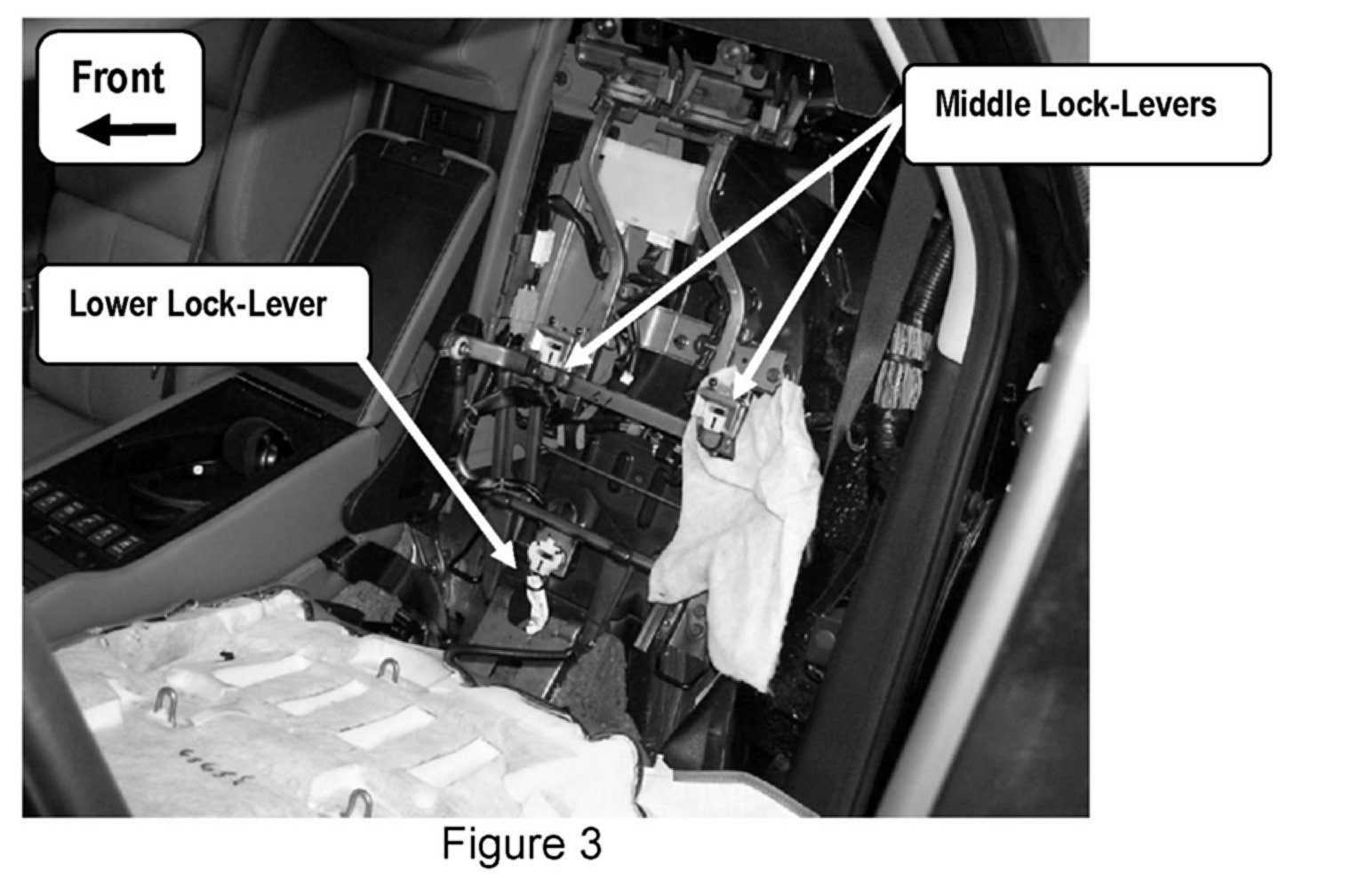 b. Then insert your hand higher in the seat back and release the two Middle Lock-Levers at the mid-point of the seat back (see Figure 3). Pull down on the plastic D-Rings to release the Lock-Levers.