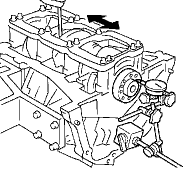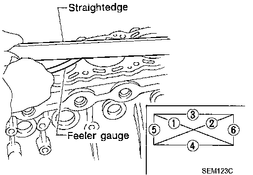 ^ Measure the distortion on the cylinder block upper face at some different points in six directions with a straightedge and a feeler gauge.
