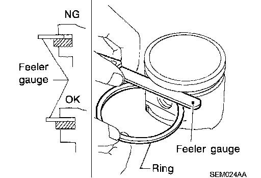 ^ Measure the side clearance of piston ring and piston ring groove with a feeler gauge.