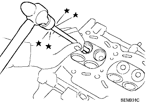 2. Drive out valve guide with a press [under a 20 kN (2 ton, 2.2 US ton, 2.0 Imp ton) pressure] or a hammer and the valve guide drift (commercial service tool).