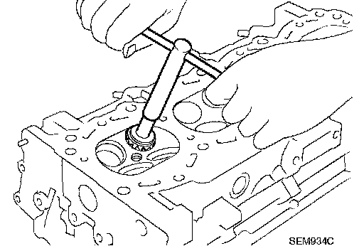 3. Using the valve guide reamer (commercial service tool), ream cylinder head valve guide hole. Valve guide hole diameter (for service parts):