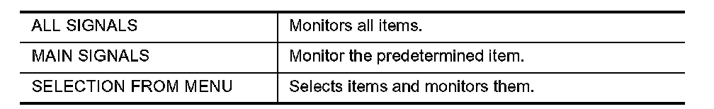2. Touch "ALL SIGNALS", "MAIN SIGNALS" or "SELECTION FROM MENU" on the "SELECT MONITOR ITEM" screen.