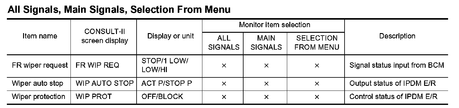 NOTE: Perform monitoring of IPDM E/R data with the ignition switch ON. When the ignition switch is at ACC, the display may not be correct.