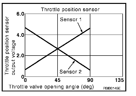 The throttle position sensor has the two sensors. These sensors are a kind of potentiometers which transform the throttle valve position into output voltage, and emit the voltage signal to the ECM. In addition, these sensors detect the opening and closing speed of the throttle valve and feed the voltage signals to the ECM. The ECM judges the current opening angle of the throttle valve from these signals and the ECM controls the throttle control motor to make the throttle valve opening angle properly in response to driving condition.