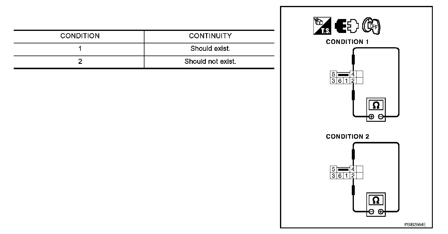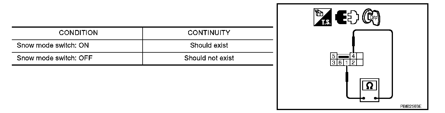 1. Check continuity between snow mode switch terminals 1 and 4 under the given conditions.