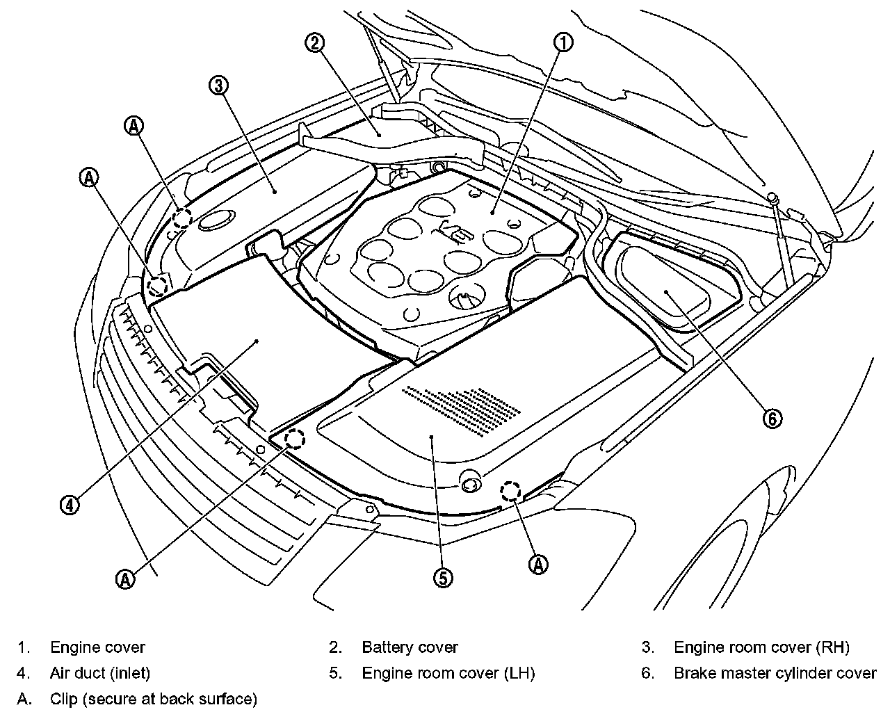 ^ Remove the washer tank cap before removing the engine room cover (RH).