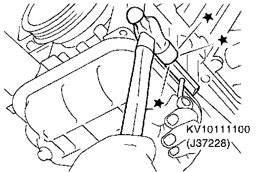 ^ Insert the seal cutter [SST: KV10111100 (J37228)] between oil pan (upper) and cylinder block. Slide seal cutter by tapping on the side of tool with a hammer. Remove oil pan (upper).