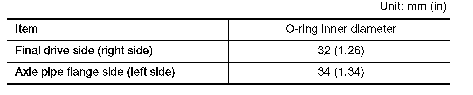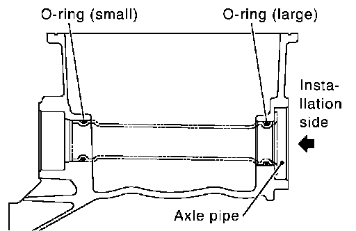 ^ Install axle pipe to oil pan (upper) from axle pipe flange side (left side) using a suitable drift [outer diameter: 43 to 57 mm (1.69 to 2.24 inch)].