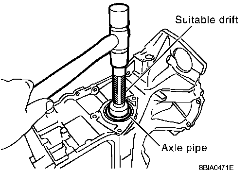 ^ Remove axle pipe from oil pan (upper) using a suitable drift [outer diameter: 37 mm (1.46 inch)].