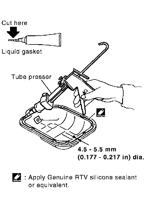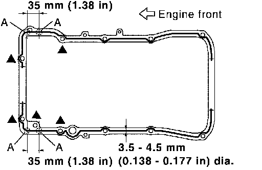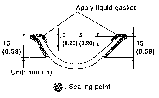 ^ Apply liquid gasket to oil pan gaskets as shown in the figure. Use Genuine RTV Silicone Sealant or equivalent.