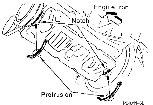 ^ To install, align protrusion of oil pan gasket with notches of front timing chain case and rear oil seal retainer.