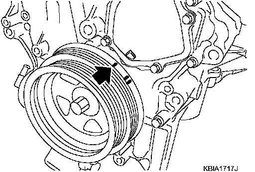 ^ Rotate crankshaft pulley clockwise to align timing mark (grooved line without color) with timing indicator.