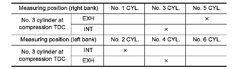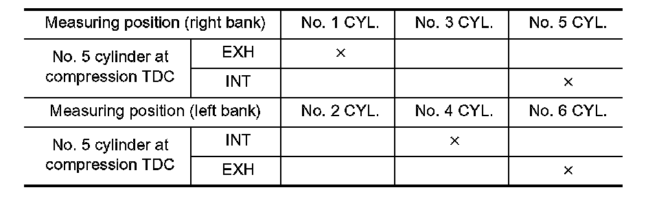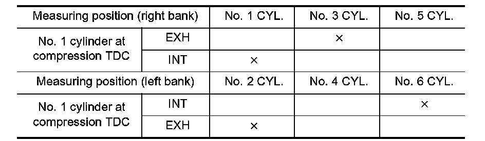 ^ By referring to the figure, measure the valve clearances at locations marked x as shown in the table (locations indicated in the figure).