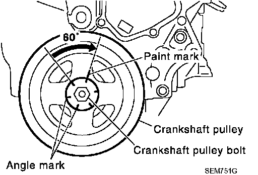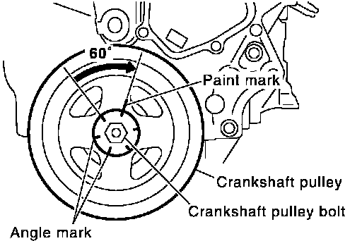 NOTE: Crankshaft pulley mounting bolt flange has a stamped line every 60 degrees. They can be used as a guide to rotation angle.