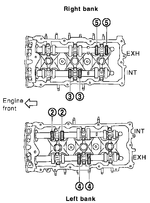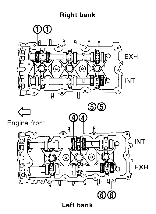 ^ Make sure that intake and exhaust cam nose on No. 1 cylinder (engine front side of right bank) are located as shown in the figure.