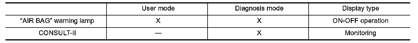 The Diagnosis mode allows the technician to locate and inspect the malfunctioning part. The mode applications for the "AIR BAG" warning lamp and CONSULT-II are as shown: