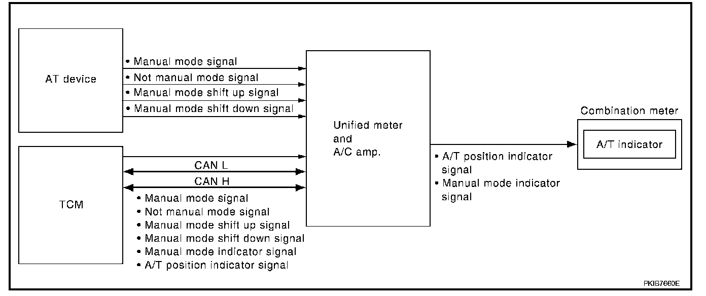 - Unified meter and A/C amp. transmits manual mode indicator signal and A/T position indicator signal to combination meter with the communication line.
