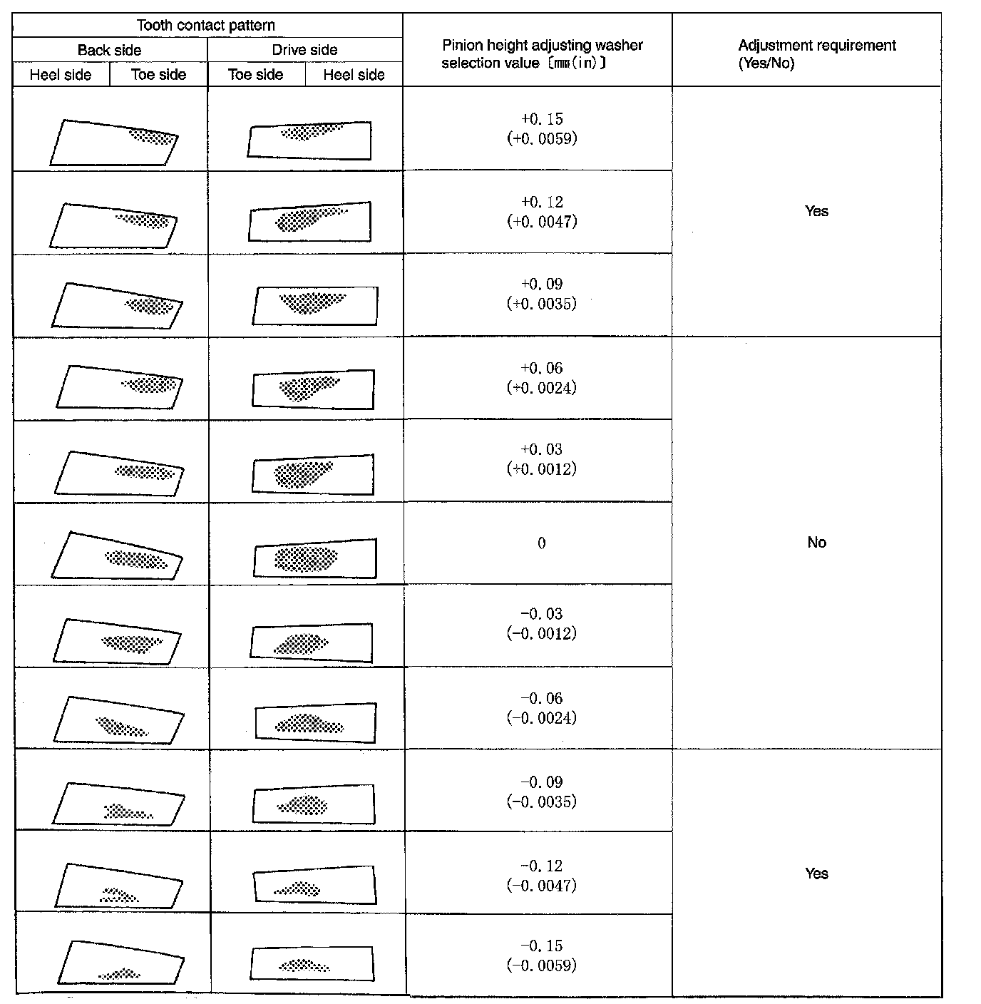 ^ If the tooth contact is near the face (face contact), or near the heel (heel contact), thicken pinion height adjusting washers to move drive pinion closer to drive gear.