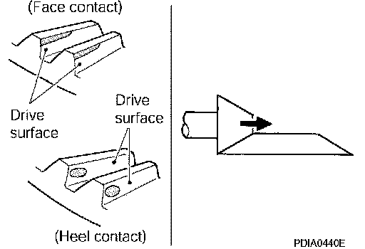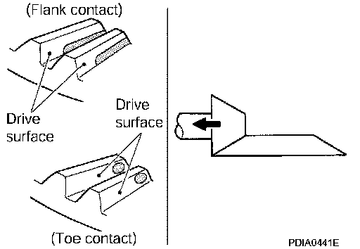 ^ If the tooth contact is near the flank (flank contact), or near the toe (toe contact), thin pinion height adjusting washers to move drive pinion farther from drive gear.
