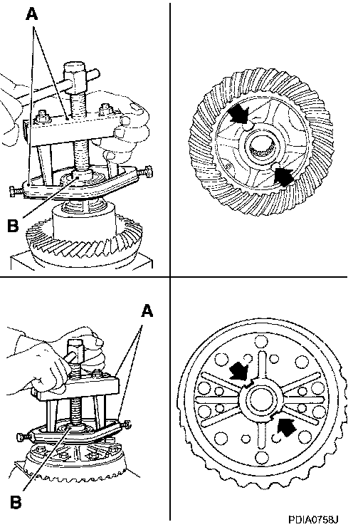 To prevent damage to bearing, engage puller jaws in groove (<-).