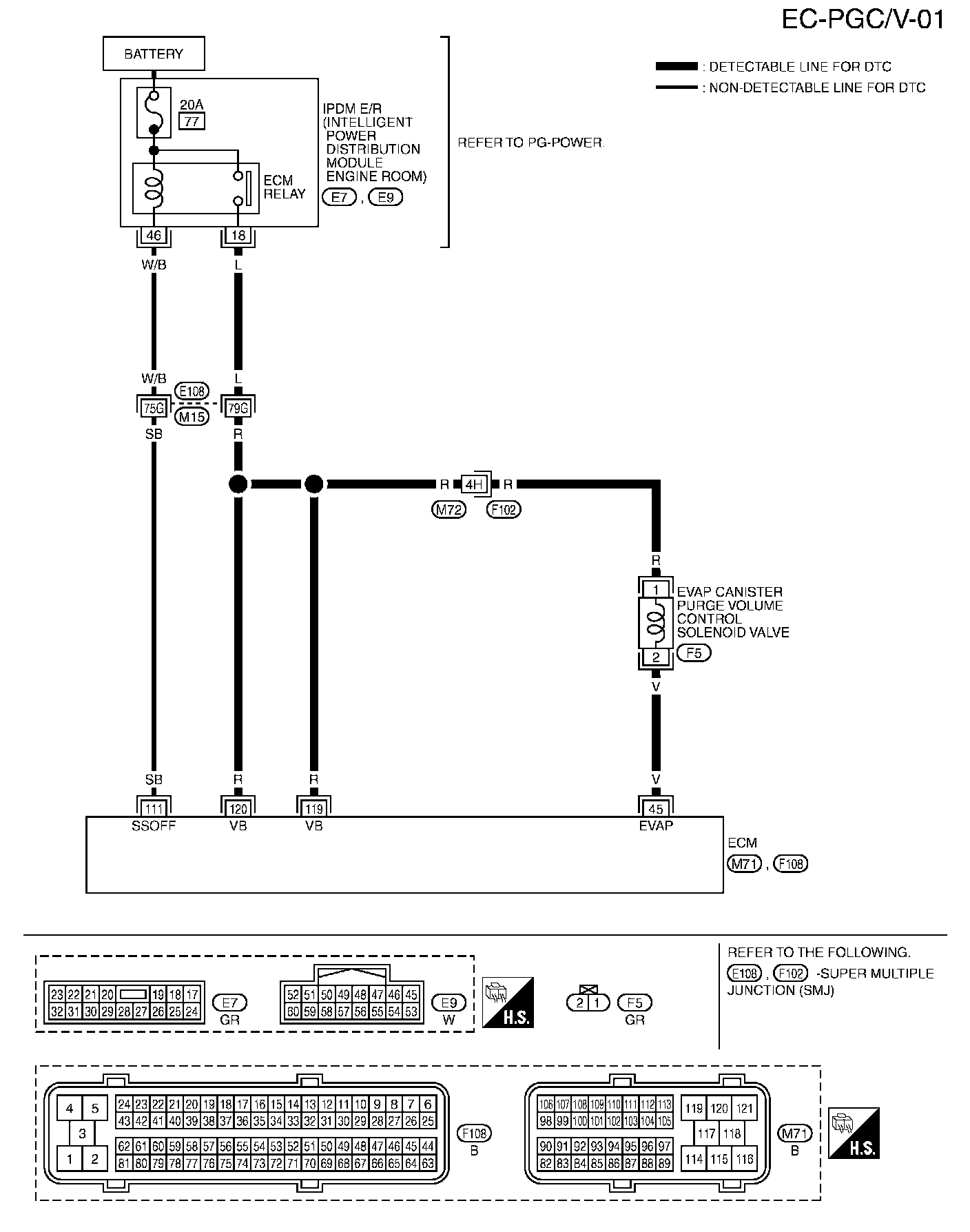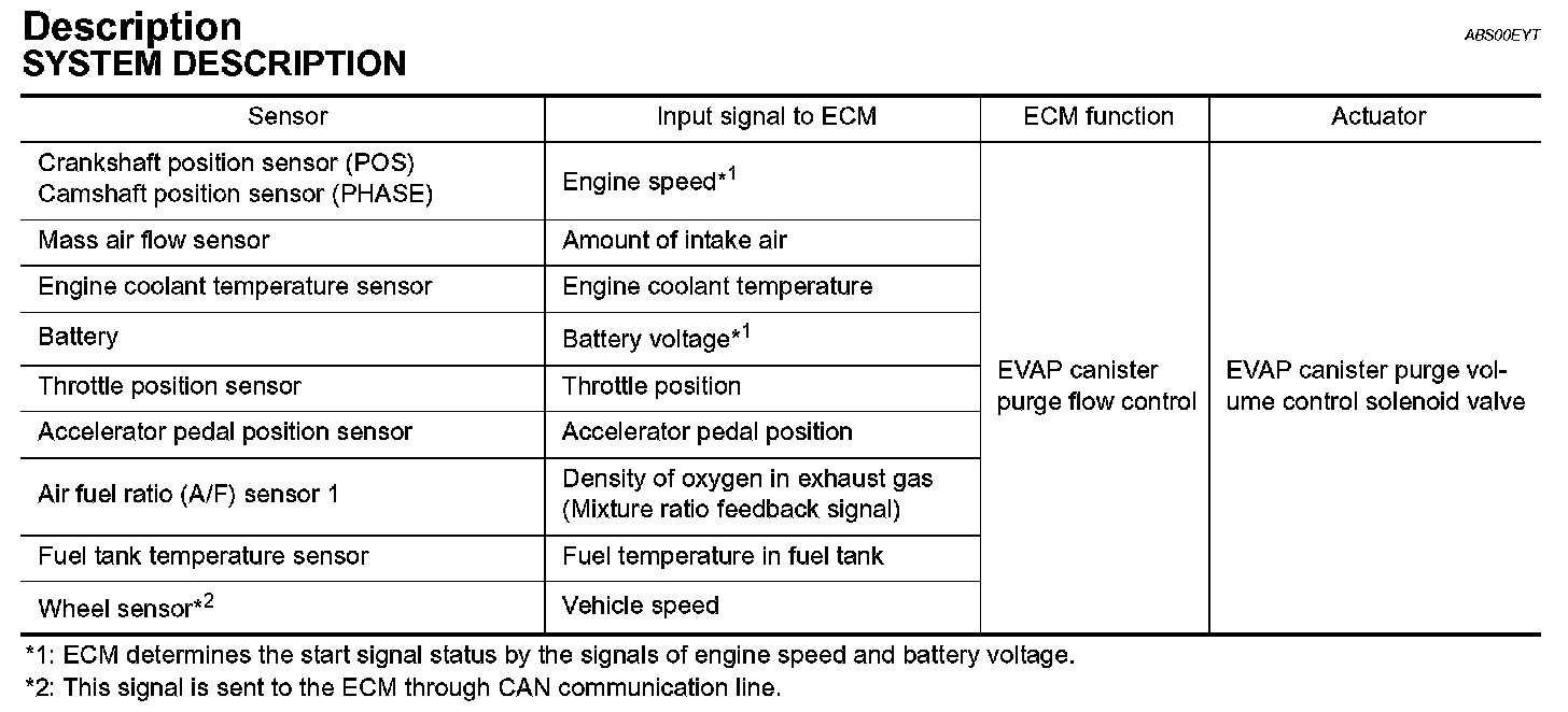 This system controls flow rate of fuel vapor from the EVAP canister. The opening of the vapor by-pass passage in the EVAP canister purge volume control solenoid valve changes to control the flow rate. The EVAP canister purge volume control solenoid valve repeats ON/OFF operation according to the signal sent from the ECM. The opening of the valve varies for optimum engine control. The optimum value stored in the ECM is determined by considering various engine conditions. When the engine is operating, the flow rate of fuel vapor from the EVAP canister is regulated as the air flow changes.