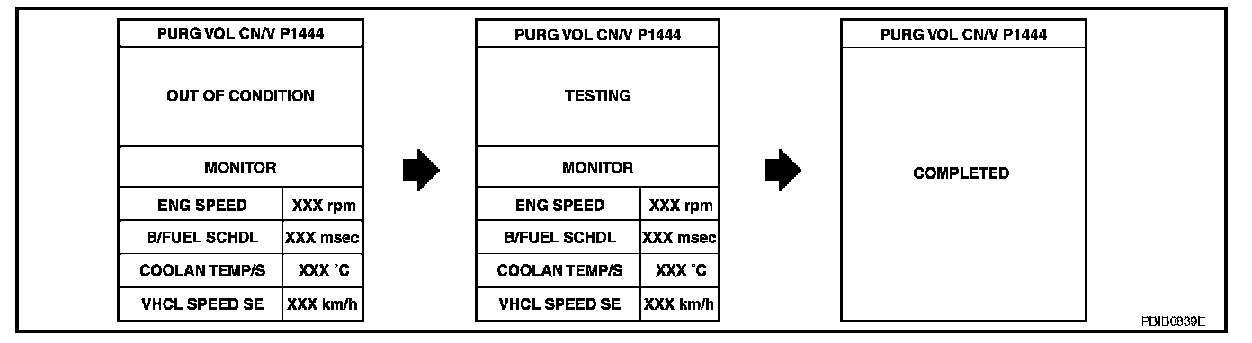 4. Select "PURG VOL CN/V P1444" of "EVAPORATIVE SYSTEM" in "DTC WORK SUPPORT" mode with CONSULT-II.