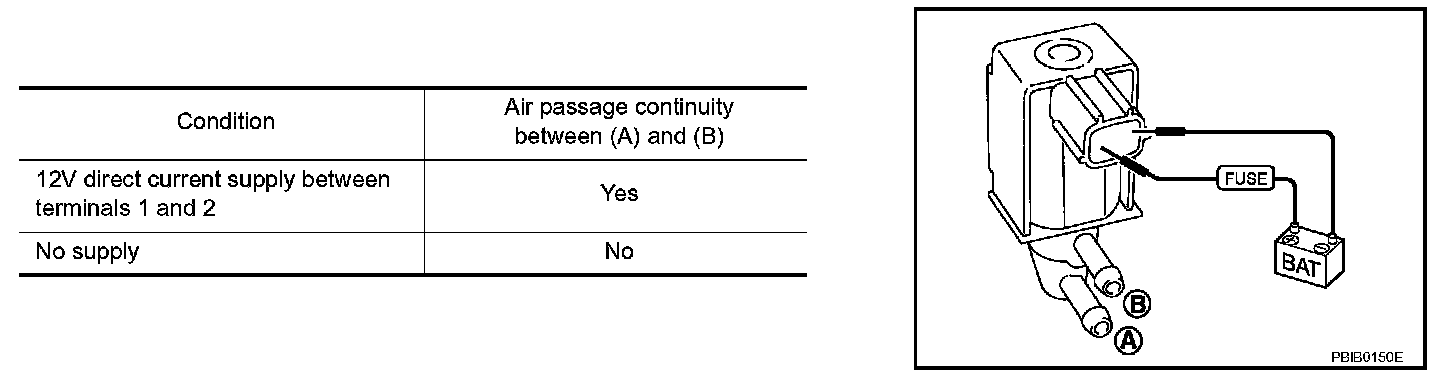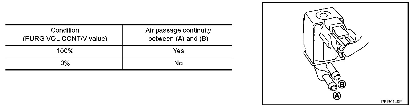 Check air passage continuity of EVAP canister purge volume control solenoid valve under the given conditions.