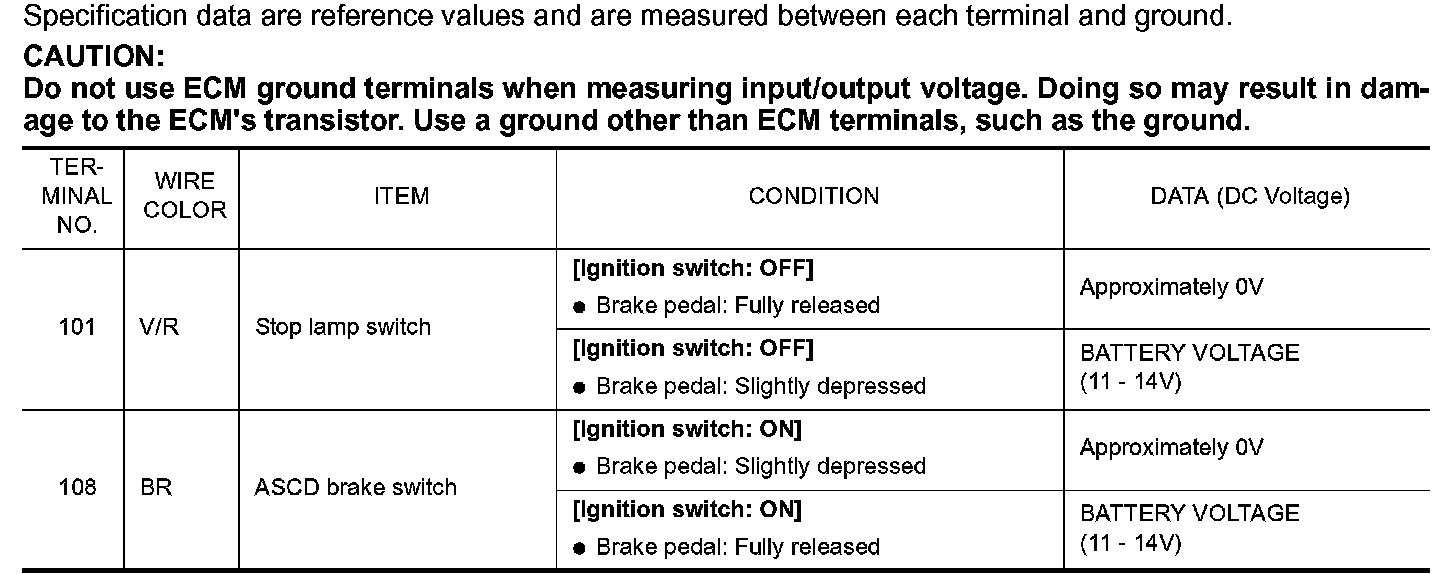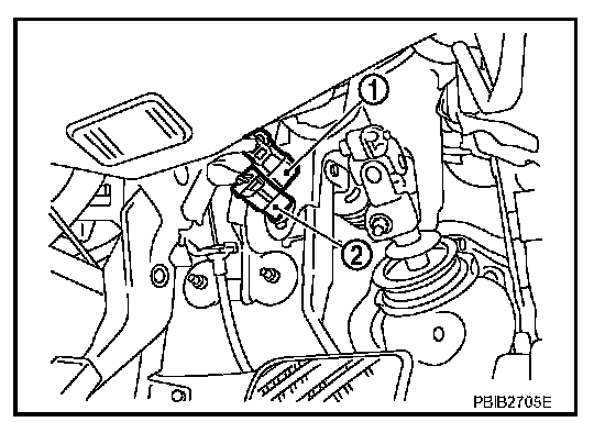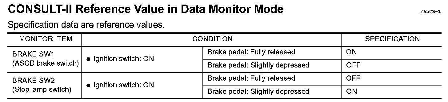 When the brake pedal is depressed, ASCD brake switch (2) is turned OFF and stop lamp switch (1) is turned ON. ECM detects the state of the brake pedal by this input of two kinds (ON/OFF signal). Refer to "AUTOMATIC SPEED CONTROL DEVICE (ASCD)" for the ASCD function.