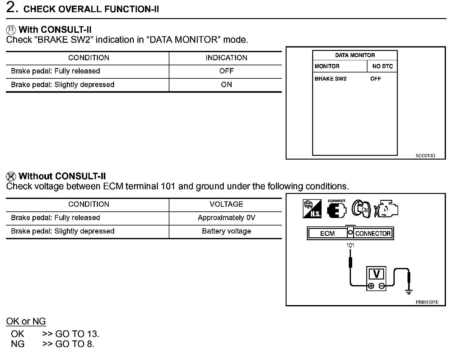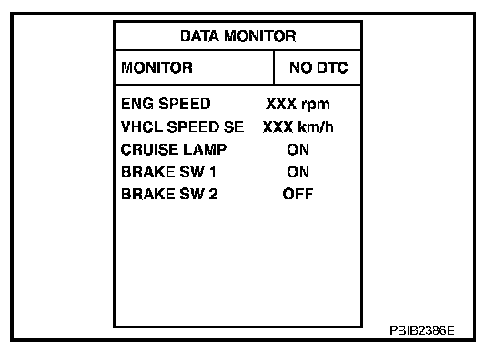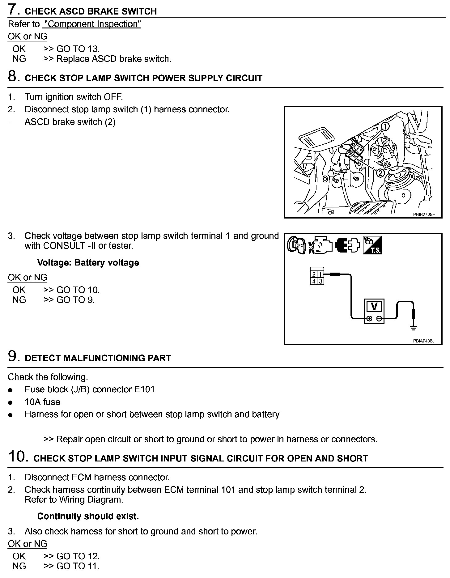 4. If NG, adjust ASCD brake switch installation, refer to "BRAKE PEDAL", and perform step 3 again.
