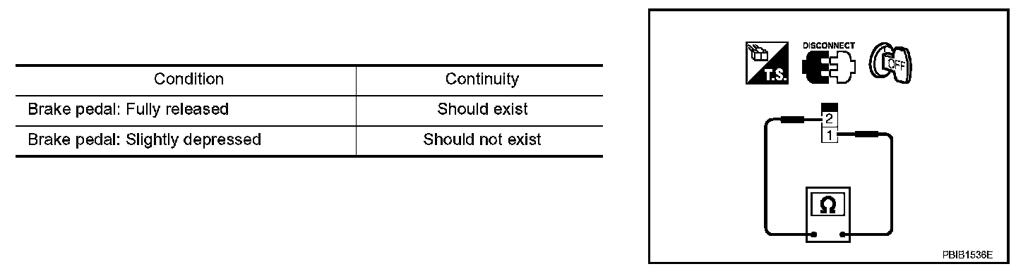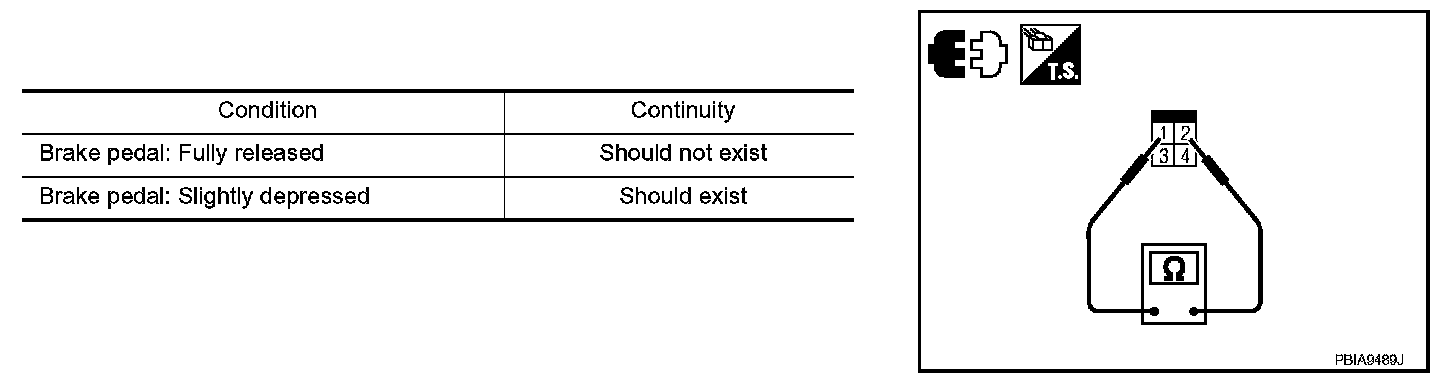 3. Check continuity between stop lamp switch terminals 1 and 2 under the given conditions.