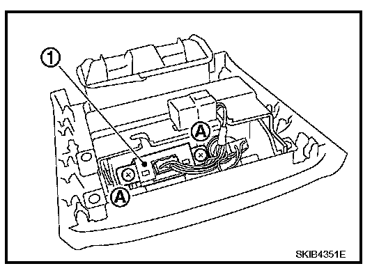 2. Remove screws (A) and disconnect connector. Remove auxiliary input jacks (1) from center console rear finisher.