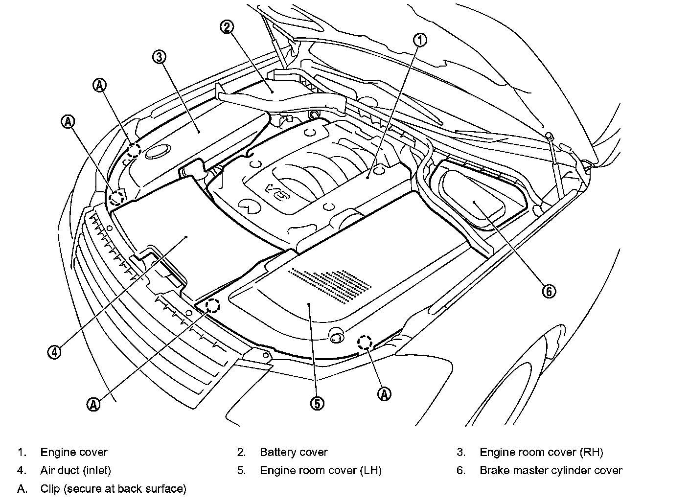 ^ Remove the washer tank cap before removing the engine room cover (RH).
