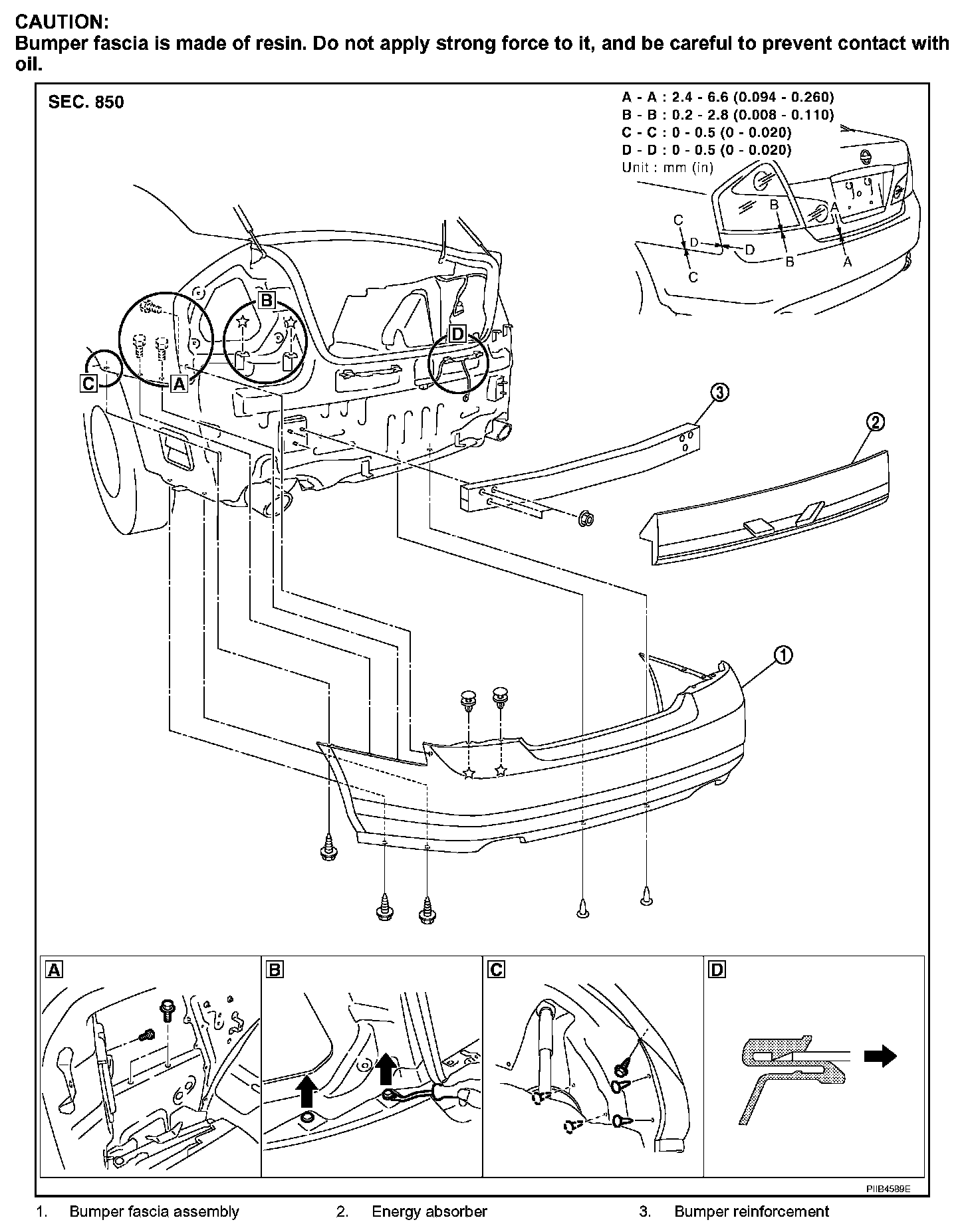 CAUTION: Bumper fascia is made of resin. Do not apply strong force to it, and be careful to prevent contact with oil.