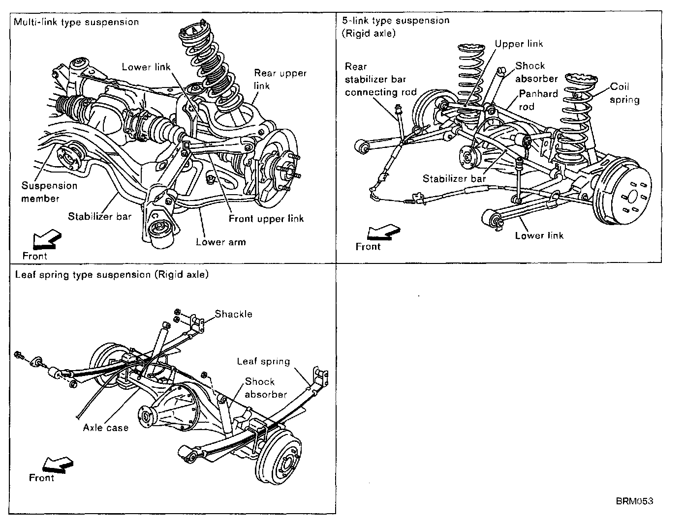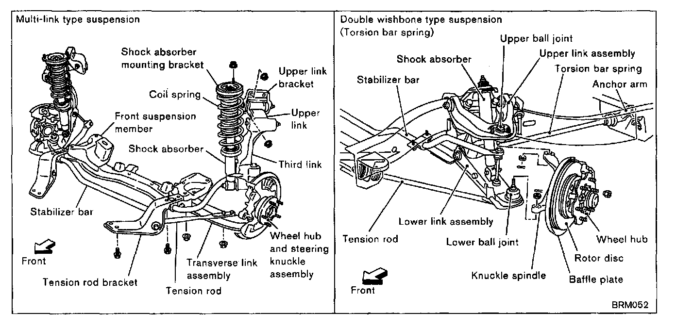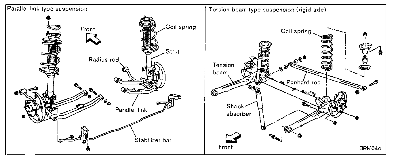 Wheel alignment inclinations must be repaired correctly to conform to design specifications. Therefore, you should understand types and installation of suspension, and should be careful when installing the suspension to repair wheel alignment inclinations. There are roughly two categories of suspensions: rigid axle type and independent type. Nissan's principal suspension types are shown as follows.