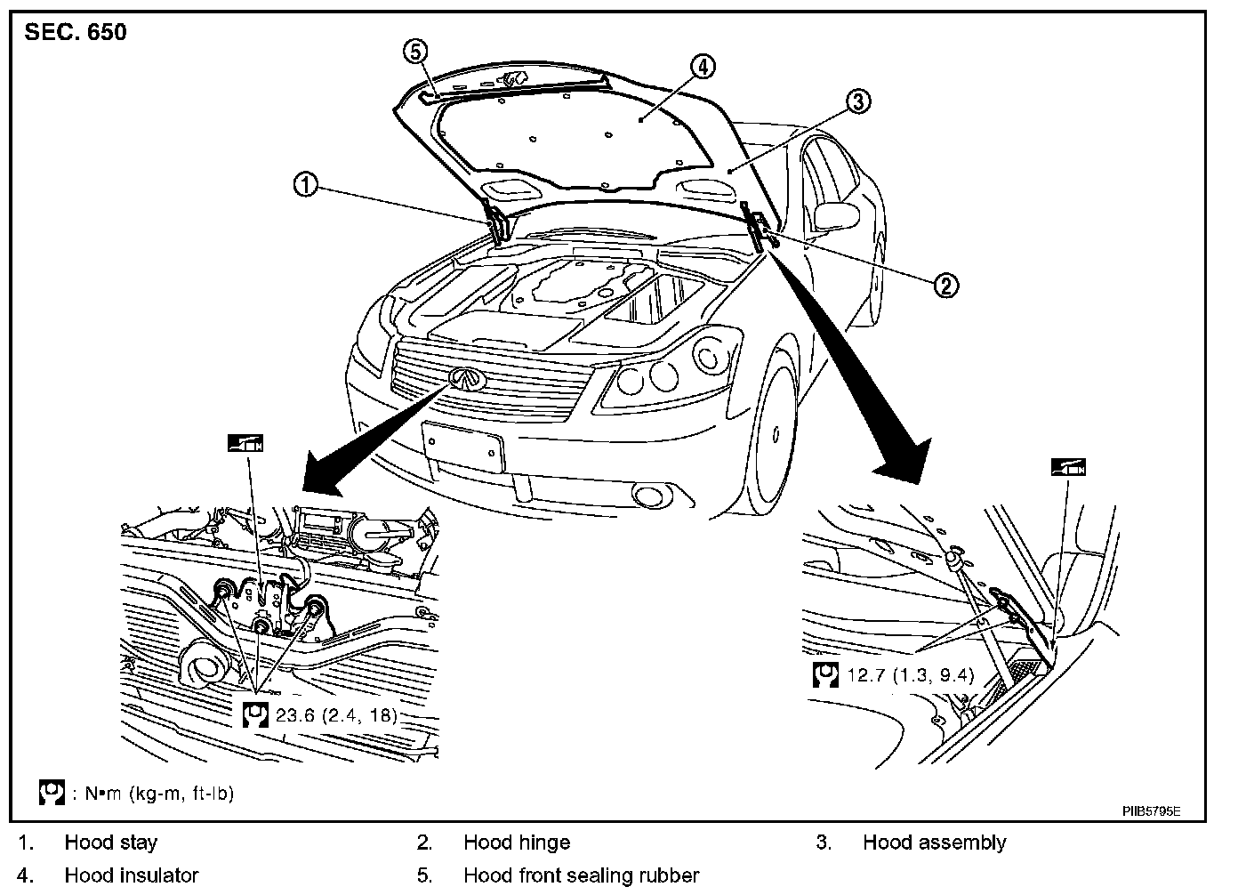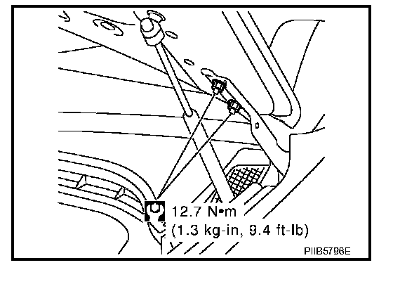 - After installing, perform hood fitting adjustment. Refer to BL-15, "Fitting Adjustment". Adjustments
