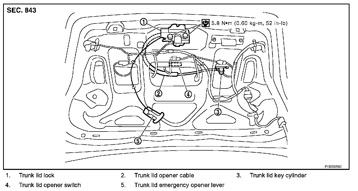5. Remove the mounting bolts, and remove the trunk lid lock.