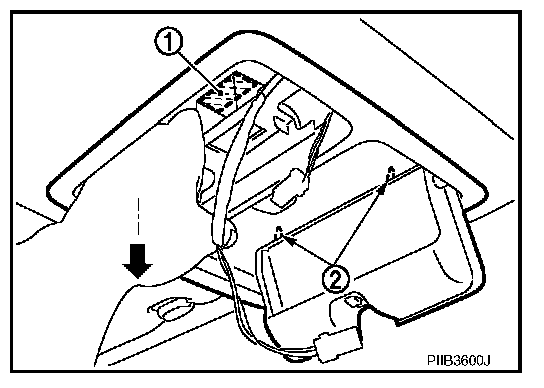 14. Pull overhead console toward vehicle lower, and disengage dual-lock fastener (1) and metal clips (2).