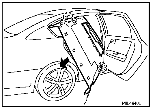 4. Remove front kicking plate inner, center pillar lower garnish, center pillar upper garnish, front body side welt, rear kicking plate inner, rear wheelhouse garnish, rear pillar finisher, rear body side welt. Refer to "BODY SIDE TRIM".