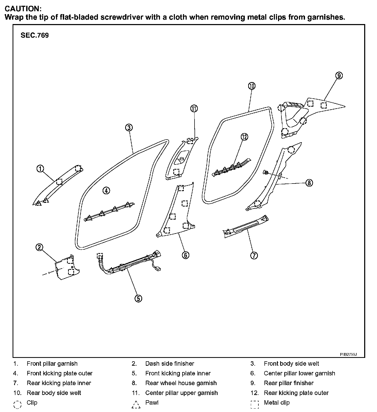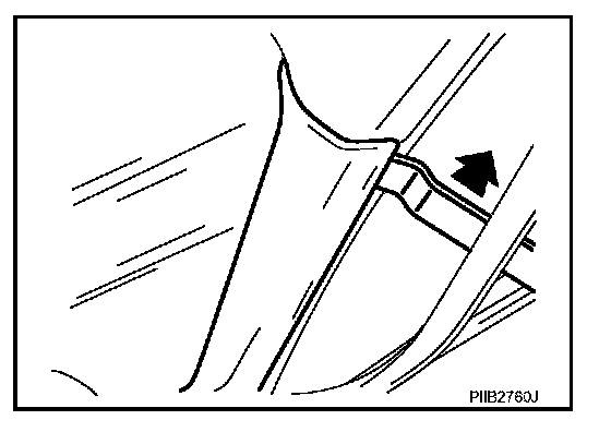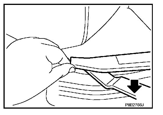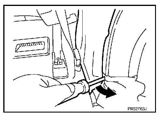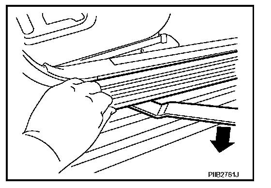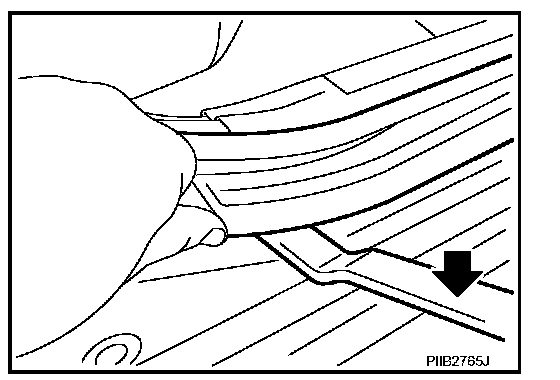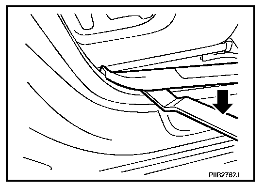 CAUTION: Insert a clip clamp remover wrapped with a shop cloth or clip clamp remover into the part shown by the arrow (between the clips and the body side panel). Remove clips.
