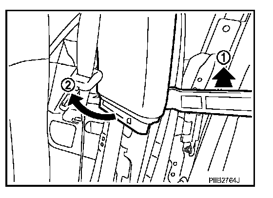 2. Remove front seat belt floor anchor bolt and front seat belt shoulder anchor bolt. Refer to "Removal and Installation of Front Seat Belt" .