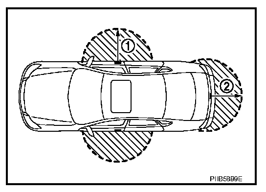 The outside key antenna detection area of door lock/unlock function is in the range of approximately 80 cm (31.50 in) surrounding the driver and passenger door handles (1). The outside key antenna detection area of trunk open function is in the range of approximately 80 cm (31.50 in) surrounding Trunk opener request switch (2). However, this operating range depends on the ambient conditions.