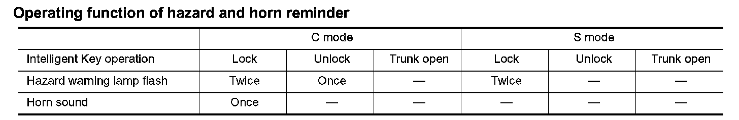 - When a door lock is locked, unlocked or trunk open with request switch or remote controller button operation, the hazard lamps flash and the Intelligent Key warning buzzer or horn sounds (Hazard and buzzer/horn reminder function).