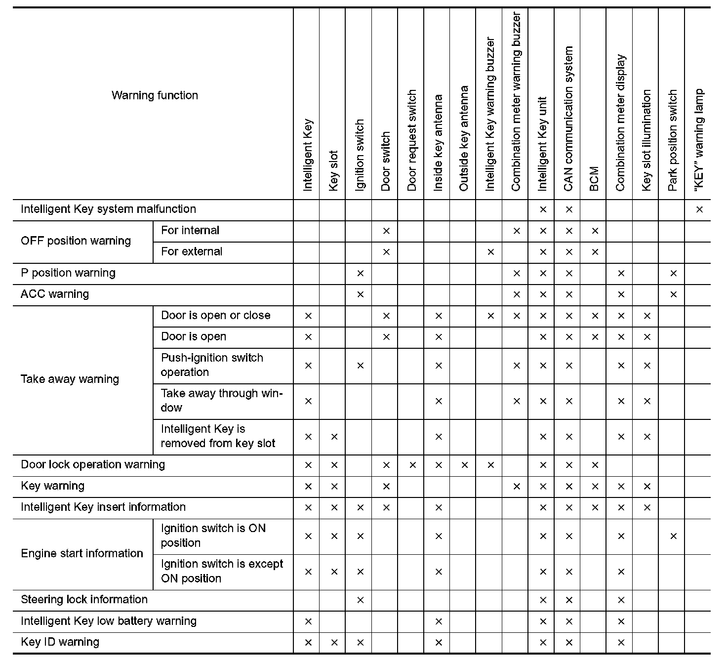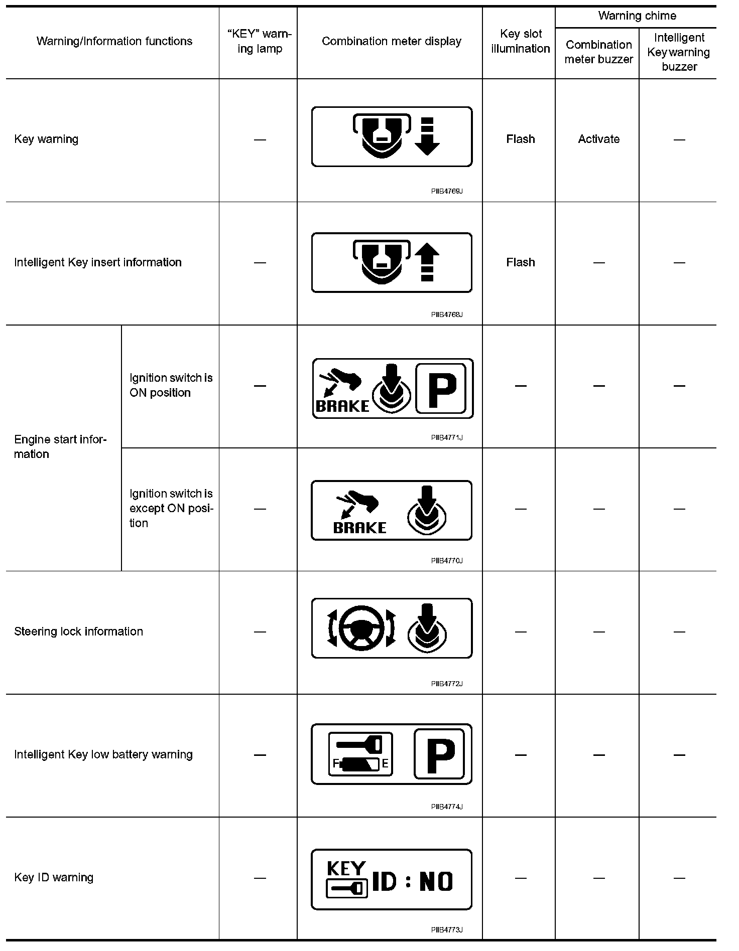 The warning function are as follows and are given to the user as warning information and warnings using combinations of Intelligent Key warning buzzer, KEY warning lamp, key slot illumination and combination meter display in combination meter.