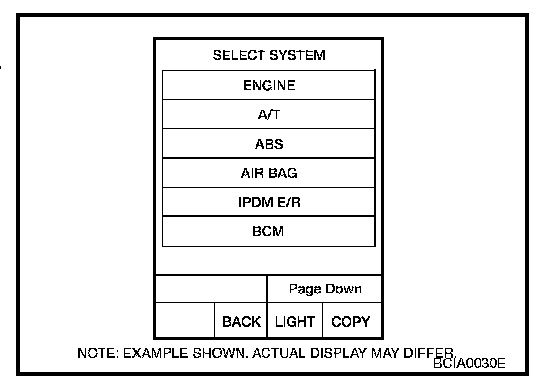 5. Touch "INTELLIGENT KEY" on "SELECT SYSTEM" screen. If "INTELLIGENT KEY" is not indicated, go to GI-41, "CONSULT-II Data Link Connector (DLC) Circuit". Schematic